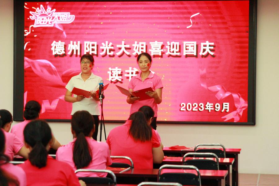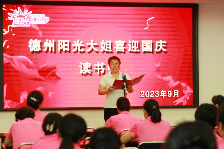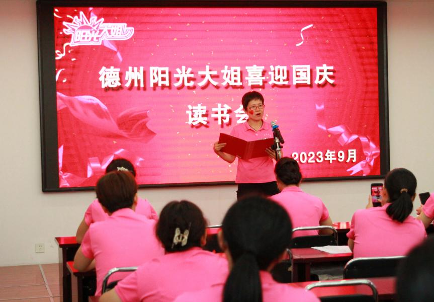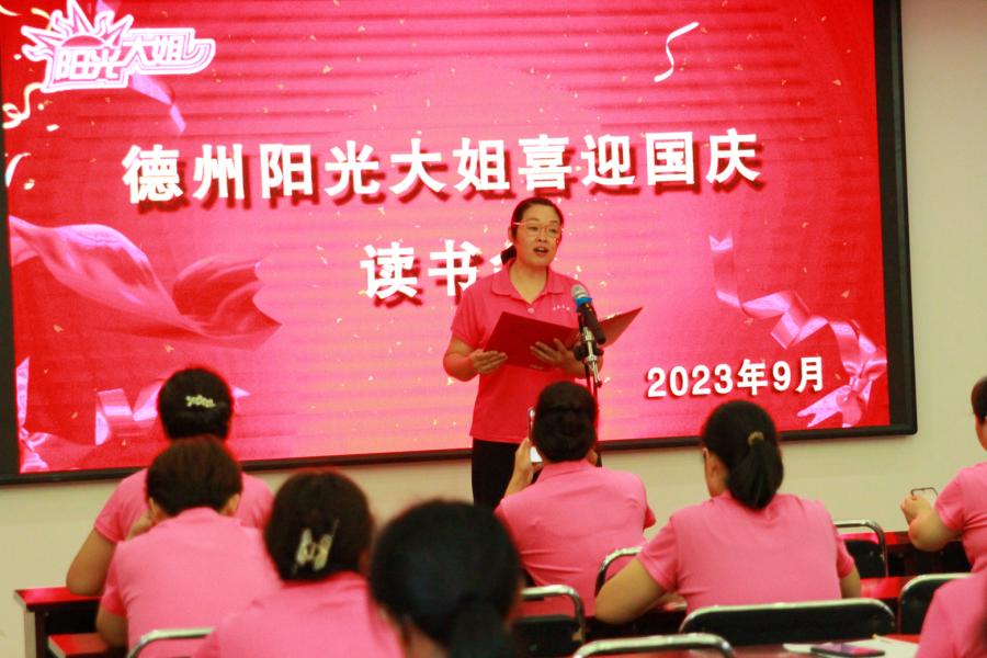 ? ? ? ?為響應(yīng)習(xí)近平總書記關(guān)于“愛讀書、讀好書、善讀書”的號召,搭建讀書交流的平臺(tái),引導(dǎo)職工形成閱讀與交流的習(xí)慣,營造職工愛讀書的氛圍,德州陽光大姐組織開展喜迎國慶讀書會(huì)活動(dòng)。在國慶來臨之際,用文明言行為祖國生日獻(xiàn)禮,用真誠的語言表達(dá)對祖國的深切祝福和熱愛。公司50余名職工踴躍參與。