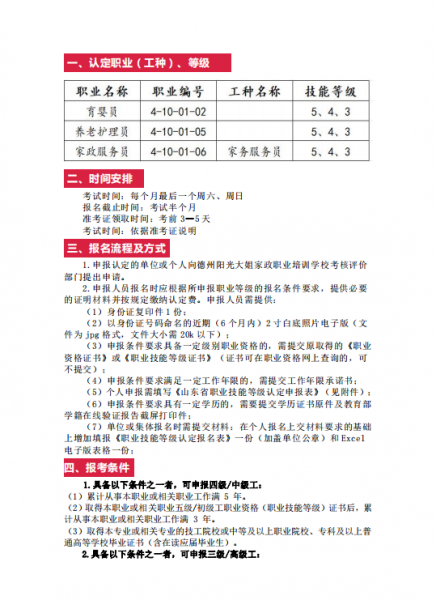 根據(jù)人力資源社會保障部《關(guān)于健全完善新時代技能人才職業(yè)技能等級制度的意見(試行)》(人社部發(fā)〔2022〕14 號)及山東省人力資源和社會保障廳《關(guān)于開展社會培訓(xùn)評價組織職業(yè)技能等級認(rèn)定試點工作的通知》(魯人社字〔2020〕50 號)、《關(guān)于進一步做好社會培訓(xùn)評價組織職業(yè)技能等級認(rèn)定試點工作的通知(魯人社字〔2022〕93 號)、《山東省社會培訓(xùn)評價組織職業(yè)技能等級認(rèn)定工作指引(試行)》等相關(guān)文件的要求,現(xiàn)將2024年度德州陽光大姐家政職業(yè)培訓(xùn)學(xué)校開展職業(yè)技能等級認(rèn)定工作的有關(guān)事項通知如下:
