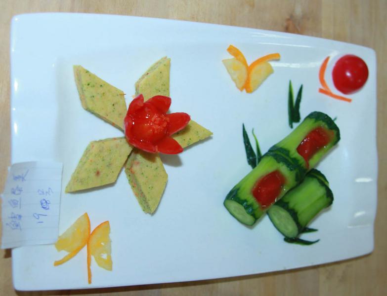 上午8點(diǎn)30分比賽正式拉開帷幕,比賽哨聲一響,大姐們互不相讓,紛紛亮出絕活一決高下。灶臺(tái)前蒸、炸、煎、炒、燉,展示了她們不凡的巧手烹飪技藝,經(jīng)過她們精心烹調(diào)與制作,一道道精美的菜肴呈現(xiàn)在評(píng)委和觀眾的面前,選手們紛紛為自己的作品取了別致的名字,如:孔雀開屏、蝦五彩骨頭湯、金槍魚雞蛋盅等,每道菜都如同一個(gè)工藝品,不僅色香味俱全,而且在滿口留香的同時(shí)還做到了營(yíng)養(yǎng)搭配均衡。來自市職業(yè)資格鑒定中心的考評(píng)員們現(xiàn)場(chǎng)點(diǎn)評(píng),分別從菜品的搭配、創(chuàng)意取名、拼盤設(shè)計(jì),以及菜品的色、香、味、意、形進(jìn)行打分。最終蔡紅莉、周艷霞、韓俊蘭、路秋菊、肖秀蘭五位大姐分獲最佳創(chuàng)新獎(jiǎng)、最佳營(yíng)養(yǎng)搭配獎(jiǎng)、最佳視覺獎(jiǎng)、最佳味道獎(jiǎng)、最高級(jí)技藝獎(jiǎng)五個(gè)獎(jiǎng)項(xiàng)。