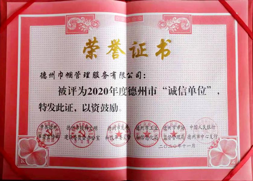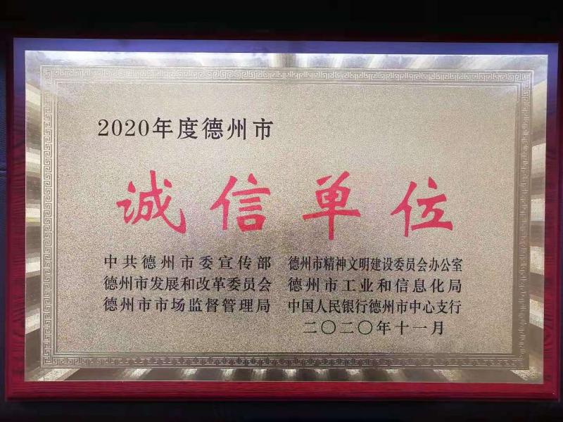 ? ? ? ?2020年10月,德州市市委宣傳部、市文明辦、市發(fā)改委、市工信局、市市場(chǎng)監(jiān)管局、市人行在全市開展“誠(chéng)信單位”“誠(chéng)信示范街區(qū)”等評(píng)選活動(dòng)。本著公平、公開、公正原則,經(jīng)過(guò)自下而上推薦、資格審查、網(wǎng)絡(luò)投票、會(huì)議評(píng)審,公司被評(píng)選為“2020年度德州市誠(chéng)信單位”。