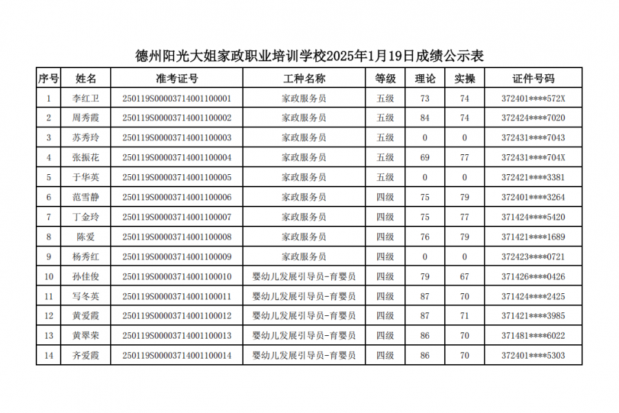 2025年1月德州陽光大姐家政職業(yè)培訓(xùn)學(xué)校職業(yè)技能等級(jí)認(rèn)定成績(jī)公示