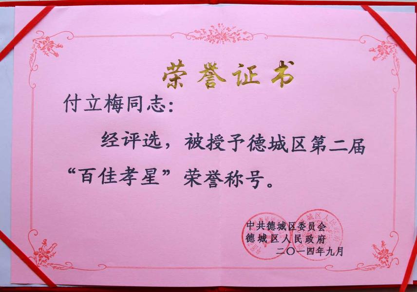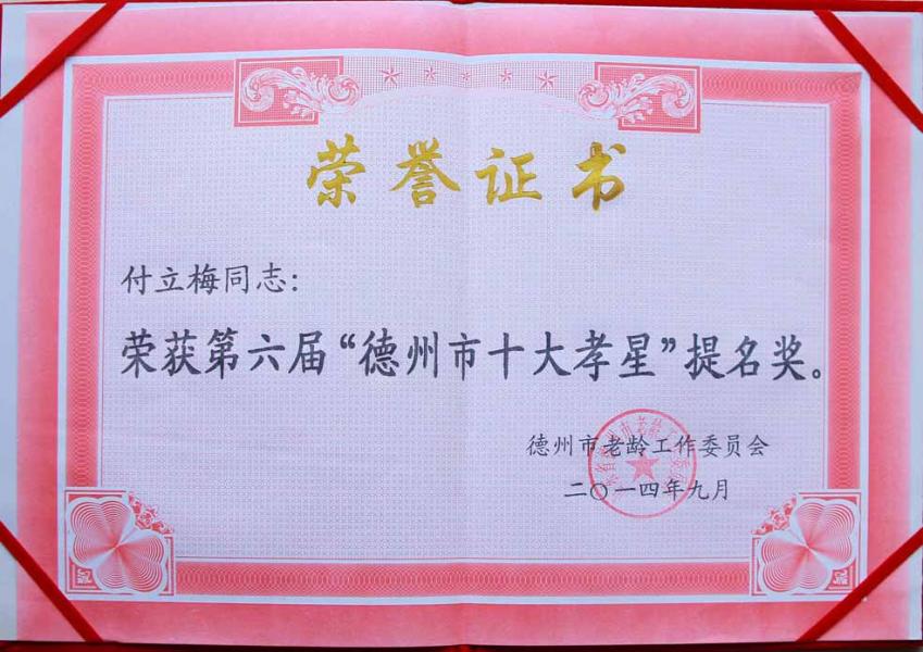 熱烈祝賀公司月嫂付立梅榮獲“德州市十大孝星”提名獎(jiǎng)和“德城區(qū)百佳孝星”榮譽(yù)稱號(hào)